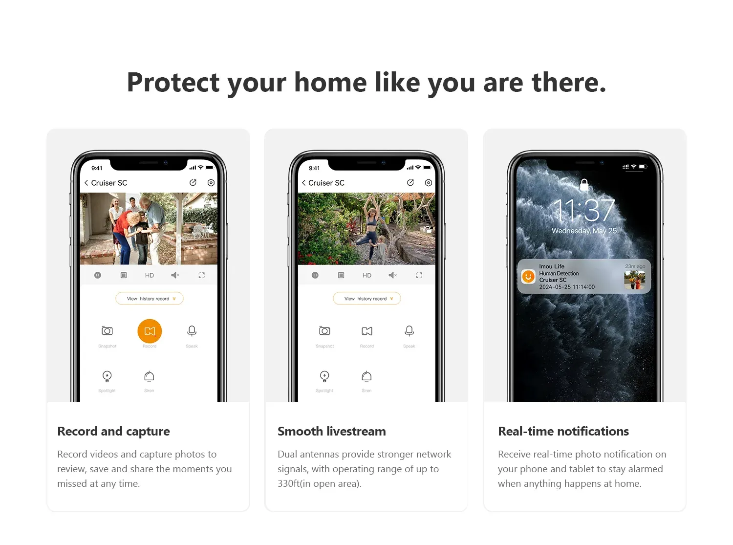 Record videos and capture photos to review, save and share the moments you missed at any time.