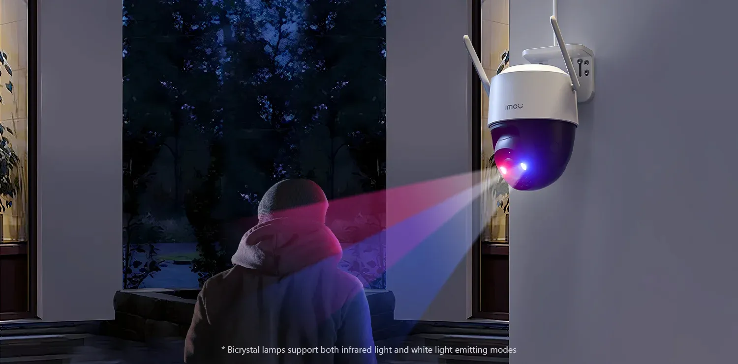 When the camera detects intrusion, with built-in spotlight and Red-Blue warning light turns on and siren starts to alert.