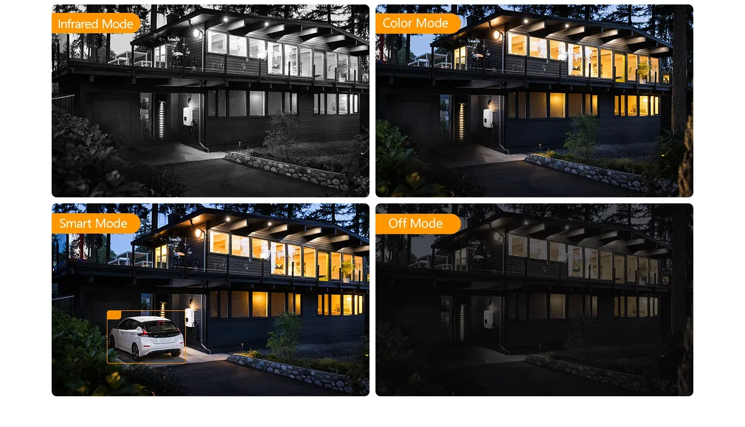 The both lenses support Four Smart Night Vision Modes, which provides clear full-color or black-and-white pictures even in complete darkness.